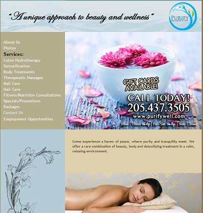 Purify Wellness and Spa www.purifywell.com 157 Resource Center Parkway Suite 113 Birmingham, AL35242 205.437.3505 They strives to create a serene environment in which to relax, rejuvenate, and refresh the body, mind and spirit. The team of highly trained professionals is dedicated to the overall well-being. They provide services like Colon Hydrotherapy, Nail care etc | View Larger Map |